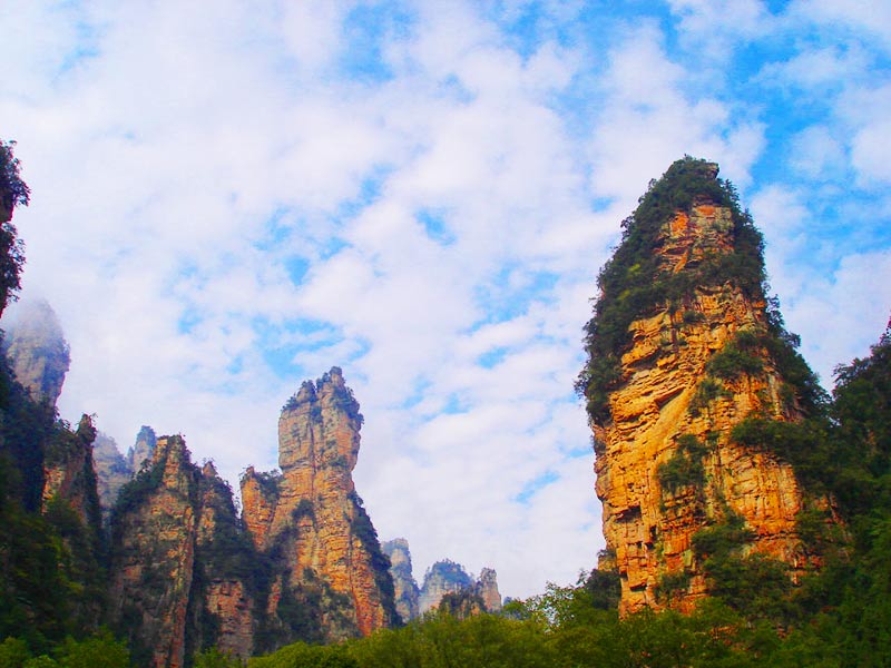 天門山國(guó)家森林公園四面絕壁,雄偉壯麗。保存著完整的原始次生林,植物資源豐富,有世界罕見的高山珙桐群落。天門山文化底蘊(yùn)深厚,留有大量贊詠天門山的詩(shī)詞,更有眾多神聞傳說,被譽(yù)為“張家界之魂”。山頂天門山寺自唐朝建成以來(lái)香火鼎盛,寺外有七級(jí)浮屠,掩映于青枝綠葉中,古雅幽清。善男信女入寺拜佛,撞鐘響徹天際,擊鼓震動(dòng)山岳,香煙裊裊如云。明萬(wàn)歷年間南岳僧在此傳經(jīng)授戒,從此聞名遐邇,朝山拜佛者達(dá)周邊四郡十余縣,信士遍及湘西北,天門山因此成為 “湘西第一神山”。天門山終年云霧繚繞,云海景象變化無(wú)窮。山間溶丘、石芽廣布,奇石秀木及珍禽異獸繁多,更有飛瀑流泉噴涌而出。天門山兼峰、石、泉、溪、云、林于一體,集雄、奇、秀、險(xiǎn)、幽于一身,被譽(yù)為空中原始花園。天門洞、天縫渡仙、五指山、將軍石等是有名的峰林景觀,還有神秘的千佛洞等待你的探奇;山間的韓家溝則是富蘊(yùn)滿族風(fēng)情的村落——這里久居的幾十戶滿族農(nóng)家至今仍完好保留著其在語(yǔ)言、飲食、衣著、居住以及婚慶殯葬等方面的滿族風(fēng)俗,是難得的民俗文化旅游地。