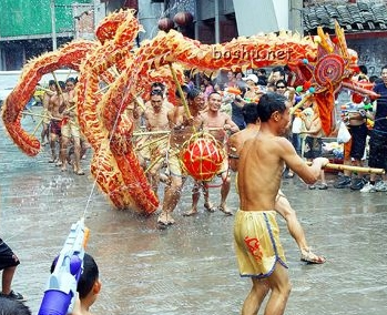 如今已發(fā)展成為對(duì)喜慶節(jié)日的慶祝,對(duì)美好生活祝福的一種方式。它用鮮棕葉作龍須,用葛藤、黃荊條、松樹(shù)枝作龍身,分9節(jié)、11節(jié)、1 3節(jié)、15節(jié)等不同長(zhǎng)度的奇數(shù),由9至15人參加舞龍。伴著鑼、鼓、鎖吶的鏗鏘樂(lè)曲,一人持“寶”在前,龍舞歡騰時(shí)有“二龍搶寶”、“蛇蛻皮”、“烏龍絞柱”等50多種動(dòng)作玩法。與此同時(shí),身著民族服裝的群眾用臉盆、水瓢、銻桶等容器端水圍繞著龍潑澆,這樣邊舞邊潑水、水潑得越多龍舞得越歡,也預(yù)祝大家當(dāng)年風(fēng)調(diào)雨順,五谷豐登,其場(chǎng)面歡樂(lè)喜慶,風(fēng)趣幽默。已列入我市第一批非物質(zhì)文化遺產(chǎn)保護(hù)名錄。
