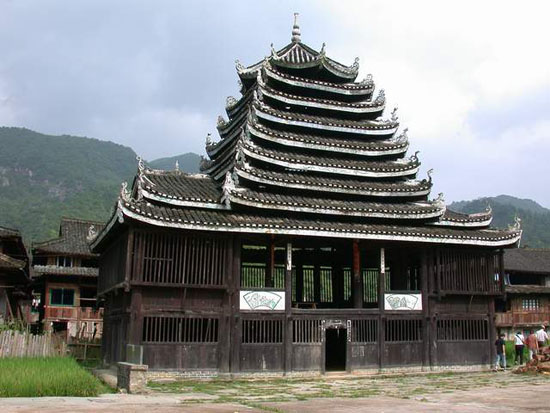 位于通道侗族自治縣坪陽鄉(xiāng)田心寨境內(nèi),始建于清順治年間,為侗族獨特建筑。方形二層樓閣,九層八柱,木結(jié)構(gòu)。邊寬8米,高20米。頂蓋為八角形,上托葫蘆寶頂。封檐板與樓內(nèi)大梁彩繪民間圖畫,各檐翹角飾禽獸浮雕。底層設火塘,四周置木凳。二樓正面系活動板壁,可兼做戲臺。