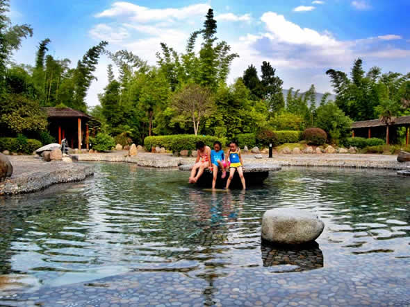 熱水溫泉,位于湘、粵、贛三省交界的熱水鎮(zhèn),是我國南方水溫最高,流量最大,水質(zhì)最好,熱田面積最寬的天然溫泉。熱水水溫一般為 91.5℃,最高達98℃。熱泉水無色透明,稍有硫化氫氣味,為低礦化、低硬度、高溫弱堿性重碳酸、硫酸-鈉型氟及硅質(zhì)礦泉水,含硅、鈉、鉀、鈣、鍶、硼、氟、氡等三十多種對人體有益的元素。其中“氡”元素正常情況含量30IMA即可做為生殖系統(tǒng)輔助治療藥物,根據(jù)聯(lián)合國教科文組織官員實地考察,福泉山莊熱泉水“氡”含量達到了130IMA左右,對治療不孕不育的生殖系統(tǒng)疾病有較好的輔助治療效果。