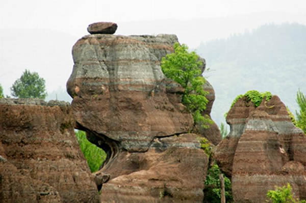 這些石柱不但顏色各異,而且大小不等。有的高達七、八米,而有些則像半埋于地下的巨獸骨架。一位村民告訴記者,現在石林沒有以前壯觀,都長渣子(灌木)了。原因是由于山頂樹木減少,雨水將泥土帶下山,很多石頭都被埋在土下,后來這些地方都開墾了農田,石林也被永久覆蓋。