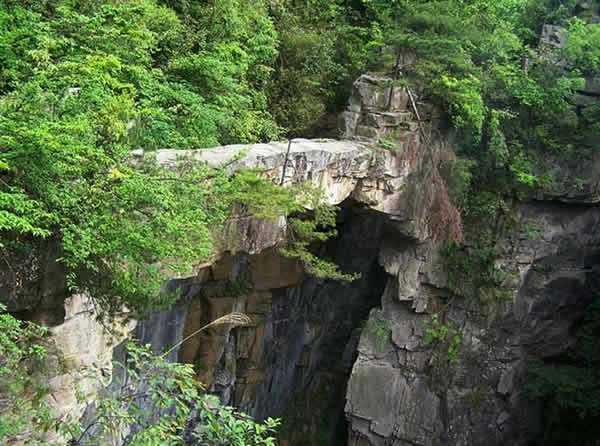 仙人橋又稱天下第一橋,坐落在猴子坡上、天子峰下的王爺洞對面。橋?qū)僮匀恍纬,長26米,寬1.5米,厚一米多,高約六七十 米,飛架在兩岸懸崖絕壁之上,鬼斧神工,惟妙惟肖,古人云:“天地可掬,此真天造也”。仙人橋為紅砂巖結(jié)構(gòu),兩端生有高大的黃山松和杜鵑樹,濃蔭掩映,極其美麗。橋的東頭還有自然形成的石級,人可順石級而下,走上天橋,下視萬丈深淵,令人頭暈?zāi)垦#墙颜卟桓矣庠,旅游者無不贊嘆,說它是“天下絕景”。