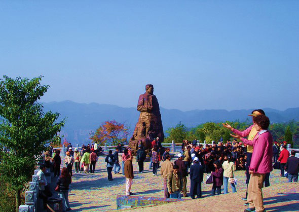 在茶盤塔的西南側(cè),有一座海拔1200多米高 的山峰,這就是“天子峰”。天子峰,看上去活象一位偉人,他坐在那里,身披鐵甲,右手握箭,濃眉隆起,兩眼怒視前方,似正要指揮千軍萬馬出征,大戰(zhàn)一場。這個形象就是人們傳說的向王天子,所以取名叫“天子峰”。
