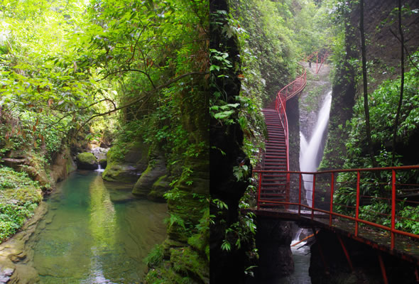 十八潭總名。稍作休憩,我們開始奔赴東線的景點。東線主要是以十八潭為主,下游有4潭:合潭、梳妝潭、魚潭、黑潭;中游有9潭:換衣潭、美人潭、石蛙潭、姊妹潭(3個)、情侶潭(2個)、二龍搶珠,上游有5潭:鬼谷神功(2個)、幽潭、落銀潭(彩虹潭)、路邊潭。十八個潭深淺不一,淺則1米以上,深則4米左右,形狀各異,有的月牙形,有的豬腰狀,形狀不規(guī)則,石壁上水沖成潭,真是鬼谷神功,此處水質(zhì)細膩,加之綠林映襯,水色碧綠見底,猶如十八顆翡翠石鑲嵌在山林之間,涓涓溪流晶瑩剔透,飛流直下的瀑布,氣勢磅礴,蔚為壯觀, 下游的4潭,合潭、梳妝潭、魚潭、黑潭。合潭是仙女峽谷與十八潭的交匯處;梳妝潭的水清如明鏡,又因為潭兩側(cè)石頭的封閉,使這面鏡子靜止不動,很方便梳妝,照鏡子。在梳妝潭周圍,有一種植物屬于紅豆杉系列,它的形狀好似梳子,可以用來梳頭。魚潭可不能望文生義。魚潭,是在冬天的時候,所有的魚都聚集在這里過冬,除此之外,這個潭水淺見底,冬天魚苗聚集,是捕魚的好季節(jié)。黑潭,水深不見底,所以叫黑潭,F(xiàn)在已經(jīng)看不見梳妝潭、魚潭、黑潭了,你猜為什么?建水庫,建水上樂園,淹沒了。 斷魂石的傳說。三國時期,高氏和蕭氏一對夫妻春節(jié)忙活,遇上了天門垮眼,受余震襲擊,打死了丈夫蕭氏。高氏思念丈夫,淚哭不斷,結(jié)果摔死潭中。人們經(jīng)常還能聽到哭聲傳來,不敢單獨行走,需成群結(jié)隊。后人為了鎮(zhèn)邪,雕刻一條蜈蚣驅(qū)趕哭魂,多年后,蜈蚣成精,天上打雷,巖石發(fā)光,遭雷所劈,成了斷魂石。 和尚姥,也就是丹灶峰,天門十六峰之一。相傳此峰為仙人化身,赤松子曾在此煉丹,許多詩人在此留下了美妙的詩篇,明代葉守禮《丹灶峰》: 懸崖峭壁隔塵寰,上有仙人學煉丹。 煉得丹成鶴已去,獨留丹灶在峰巒。 意思是說,在這險峻秀麗的山峰上,赤松子潛心煉丹,不受塵世干擾,身心沉醉于秀美的山間,沉溺于丹藥的煉制之中。作者很是羨慕那種與世隔絕的超脫,那種執(zhí)著于自我理想的瀟灑,你羨慕不羨慕? 竹林叢生。我們要學習竹子的精神,中空、謙卑;我們要學習竹子的精神,抱團生長;我們要學習竹子的精神,破土而出,節(jié)節(jié)高。 向家塔。打造農(nóng)耕養(yǎng)生游的地方。種田、種菜、種花,農(nóng)家餐館。 爛泥巴根。爛泥巴根和馬桑樹是同科,是這里獨特的一種樹。馬桑樹亦稱“千年紅”、“馬鞍子”,屬落葉灌木,馬桑樹多枝叢生,一簇一簇的,枝葉像傘蓋,因此“馬桑樹兒搭燈臺”。春風一吹,滿山的馬桑樹、爛泥巴根就吐翠滴綠,顯示出強勁的生命力。打油詩一首: 青青枝條四方走, 肥肥大葉落上頭, 身在路邊無人問, 冬去春來樂悠悠。 秋天死亡,春天長勢更加茂盛,它的新生是通過死亡實現(xiàn)的。山川如此,植物也是如此,這里的一草一木無不透露著道家那種齊生死、等貴賤的精神。 這叫“常道”亭,“道可道,非常道”,據(jù)說是白狐與劉海相遇的地方。吊橋。 十八潭各具特色。 中游有9潭。第五潭叫換衣潭。巖石聳立,霧氣氤氳,巖壁上布滿水汽,猶如雨下。又因過道狹窄,行人需彎腰通過,未免雨水打濕衣裳,在此就要脫下身上衣物,通過后在第六潭再穿上。因此第六潭又叫美人潭,很幽深神秘的。第七潭叫石蛙潭,水淺,又比較平穩(wěn)、安全,春天產(chǎn)籽。余音回響,猶如蛙鳴,給人“聽取蛙聲一片”的錯覺。 對面巖壁叫“臘肉鋪”,那條自上而下的溪流叫“酒長流”,客人來了,咱土家人熱情,臘肉下炕,苞谷燒,喝兩口! 第八潭第九潭叫情侶潭,比較隱蔽,他倆靜悄悄地談著情話,我們快走,不要打攪他們。 第十潭、十一潭、十二潭叫姊妹潭。下面那個,水淺淺的,溫溫的,是幺妹潭,中間那個是二哥潭,上面那個是大哥潭。 潭的旁邊有珍稀植物馬蘭花,馬蘭花又名蝴蝶花、蝴蝶蘭,為多年生宿根草本花卉,根莖短粗,肥壯;ù笮缕,花色絢麗,鮮艷奪目;ㄓ兴{、白、黃、雪青等色。花期5-6個月,每次花可開花7-10天,頗耐觀賞。馬蘭花在我國栽培已有2000多年的歷史,目前歐、亞、非3洲均有分布,品種極多,難以計數(shù)。此花按植株高度不同可分3種類型:矮株型僅18-25厘米,中株型高25-70厘米,高株型可高達120厘米。馬蘭花喜陽光,適栽于背風向砂質(zhì)土壤中。 馬蘭開花的童謠。他們?nèi)⒚眯r候情感深厚,常常一起跳皮筋。大家會跳嗎?會唱嗎? 小汽車,滴滴滴,馬蘭開花二十一, 二五六二五七,二八二九三十一, 三五六三五七,三八三九四十一, 四五六四五七,四八四九五十一, 五五六五五七,五八五九六十一 。…… 還有紅豆杉,像梳頭的篦子,叫“篦子三尖杉”。還有蘭心草,中草藥,空中飄來蘭花的香氣,山谷中峭壁的蘭花,如芳芳人品善良高雅。蘭花如人品有宜人的香氣,蘭花有撩人的幽香,任何花卉的香氣都不能與蘭花比。這幽香時隱時現(xiàn),時濃時淡,時遠時近。飄蕩在老道灣山谷中,給人清新和愉快的感受。 蘇轍有詩:“谷深不見蘭生處,追逐微風偶得之”。 還有大葉榕、玉葉金花、秋海棠、臘蓮繡球、四字馬蘭、紅楓,秋天來臨,看!漫山紅遍,層林盡染。 聞道亭。孔子曰:朝聞道,夕死可以。意思是說,人生悟到“道”的真諦是多么重要,如果是早上知道的,哪怕晚上去死都是值得的。 第十三潭叫二龍搶珠。兩條瀑布傾瀉而下,在中間交匯,就像是二條龍爭搶寶珠一樣。結(jié)果,這寶珠被狐王拿到,狐王又