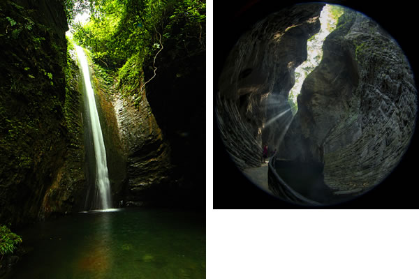 走在吊橋中間,必須保持自身的平衡方能安全通過,不然就會在吊橋上搖擺不定。走出仙女峽谷,往下看,深不見底,七潭七瀑在奇險之中不乏壯觀,這里曾發(fā)生過跳潭救女的故事。