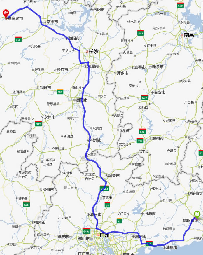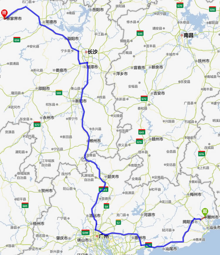 現(xiàn)在位置:張家界旅行社->交通指南->自駕車路線 -> 揭陽到張家界旅游自駕車線路,揭陽去張家界自己開車要多長時間,有多少公里