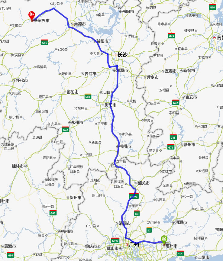 番禺去張家界自駕車(chē)自助游線(xiàn)路圖全程高速):