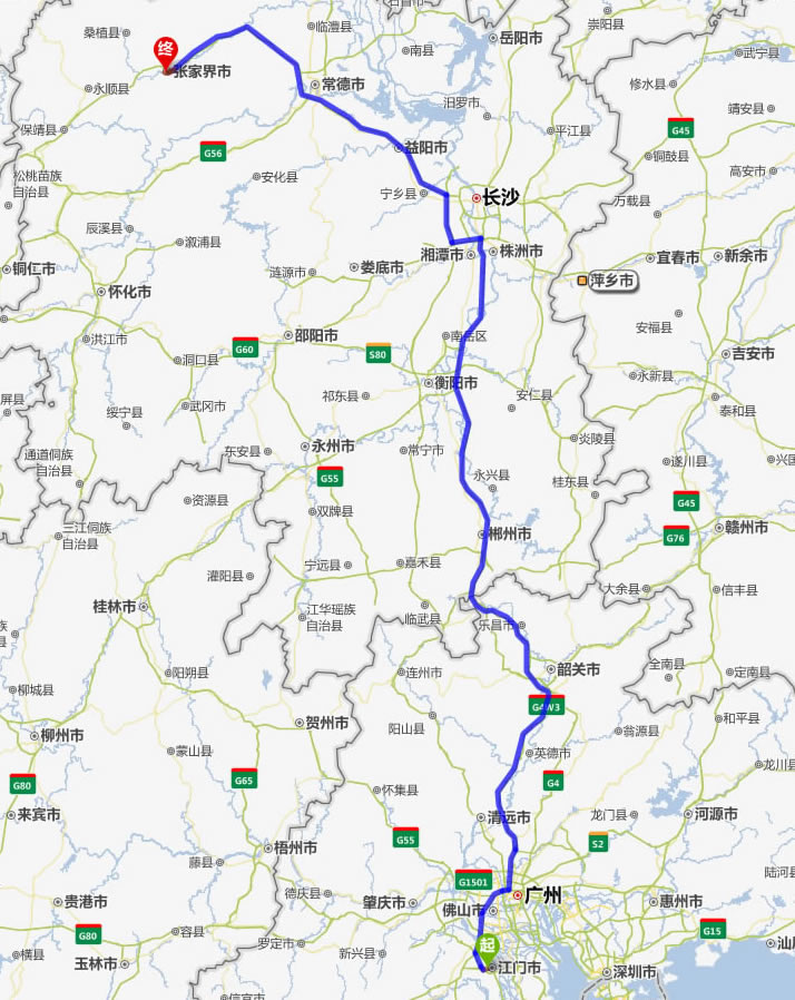 左右,沿途經過江門——佛山市——廣州市——清遠——英德市——韶關市——樂昌市——宜章縣——郴州市——耒陽市——衡陽市——湘潭市——寧鄉(xiāng)縣——益陽市——常德市——慈利縣——張家界。