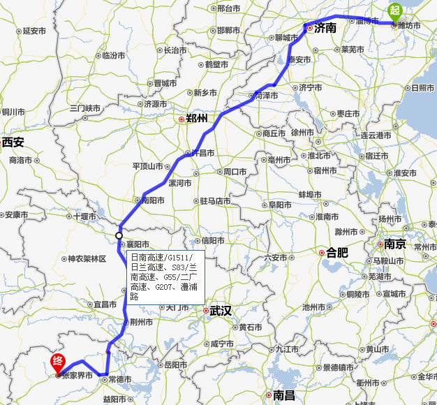 濰坊去張家界自駕車(chē)自助游線(xiàn)路圖全程高速):