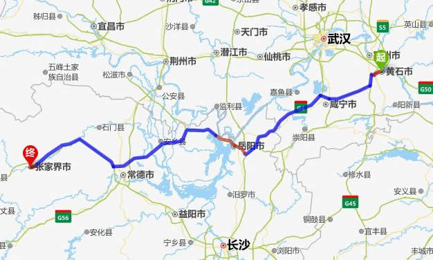 左右,沿途經過黃石——咸寧市——岳陽市——安鄉(xiāng)縣——常德市——慈利縣——張家界。