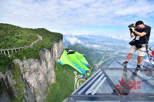 2017世界翼裝飛行世錦賽將于9月8日-10日在張家界天門(mén)山舉辦。開(kāi)賽在即,9月7日上午,來(lái)自全球11個(gè)國(guó)家的16名翼裝飛行員從海撥1458米的張家界天門(mén)山玉壺峰頂一躍而下,在奇峰險(xiǎn)壑間進(jìn)行競(jìng)速訓(xùn)練。